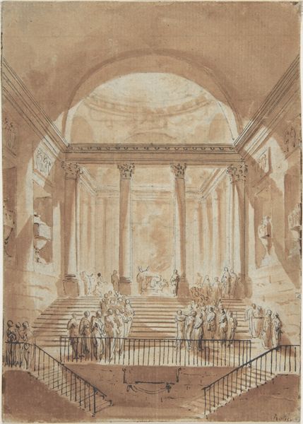 Curator: Standing before us is "A View of the Vestibule of Santa Maria Maggiore at Rome," a work created by Georges François Blondel between 1765 and 1767, now housed at the Metropolitan Museum of Art. This print, combining etching, charcoal, and pencil, presents a majestic architectural scene. What’s your initial impression? Editor: Oh, wow. There's an imposing atmosphere, definitely. It's like the columns are these silent giants, framing something grand and slightly melancholy in the distance. The lighting seems to accentuate this solemn monumentality. Curator: Absolutely. Blondel uses the sharp lines of etching to meticulously capture the vestibule’s architectural details and relies on charcoal and pencil to offer it a dreamlike quality. The strategic use of shadow enhances the dramatic scale of the space. This focus mirrors Neoclassical ideals, evoking grandeur and order. Editor: Neoclassical for sure, but there’s also this undercurrent of Romanticism, isn't there? The tiny figures almost seem swallowed up by the enormity of the architecture, inviting feelings of sublime awe. It’s kind of terrifying and beautiful all at once, right? Curator: Precisely! The composition invites that feeling. Blondel juxtaposes the monumental architecture with the minute human presence, a common technique in depictions of ancient ruins and grandiose architecture. The technique adds to that sense of ephemeral human life against an eternal, powerful past. Editor: I like how you describe that, but I feel so conflicted looking at it, honestly. It’s like a stage set—incredibly constructed, precise, but still, somehow, leaves me feeling strangely disconnected. It captures a historical ideal but struggles to breathe. Does that even make sense? Curator: It makes complete sense! What you're touching upon is a tension inherent in Neoclassical art: the struggle between idealization and lived experience. However, the skillful handling of tonal gradations gives warmth. It softens what otherwise might be a clinical representation. Editor: And in his softness it gives that perfect hint of mystery? A little human emotion breaking through the order and precision of his formalist constraints? The light that could offer something hopeful beyond those overwhelming structures? Curator: It offers an intimate encounter with the weight of history. Blondel provides a contemplative look at humanity's place amidst the grandeur of Rome, if you will, as history fades like that last little spark of light. Editor: So much beauty, so much complexity in one still, quiet moment.