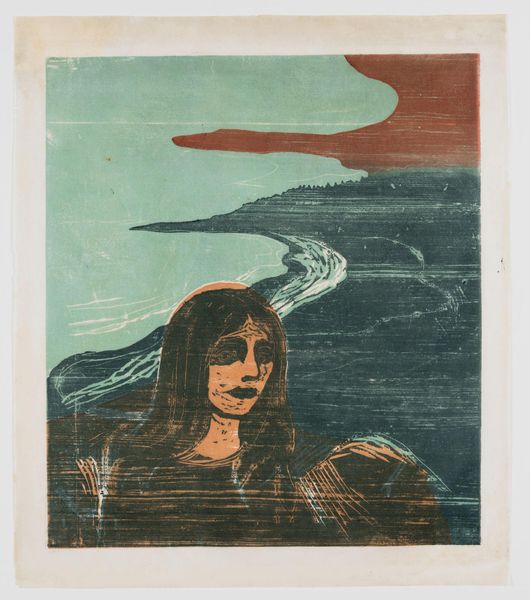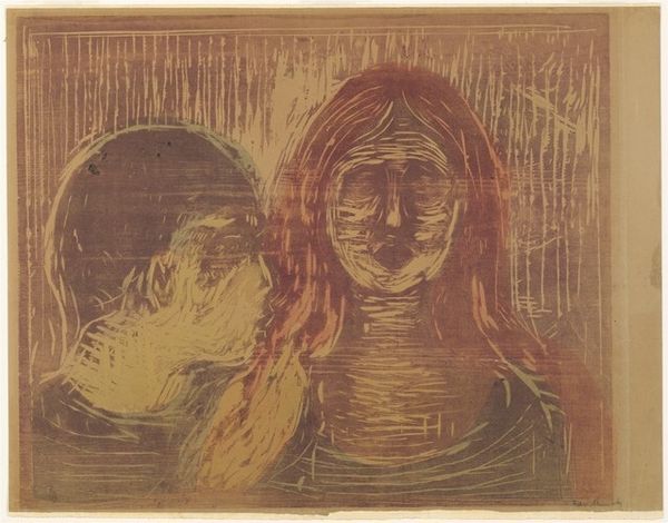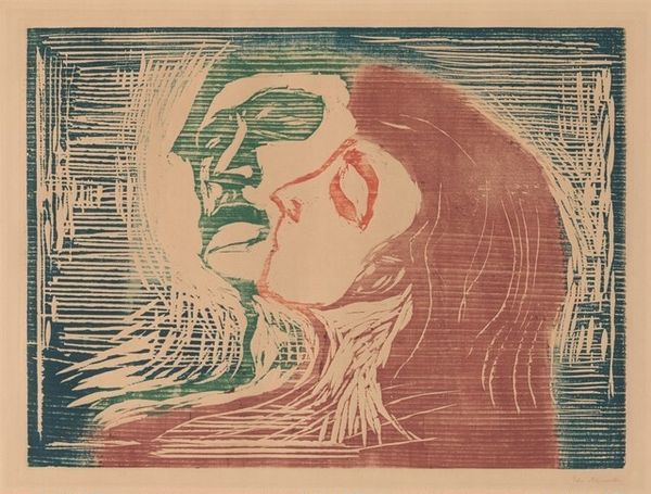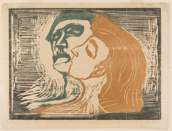 Curator: Edvard Munch’s "Head by Head," currently housed at the Harvard Art Museums, is a woodcut print rendering of two faces merged in a kiss. Editor: It strikes me as incredibly raw, almost violent in its intimacy. The stark lines of the woodcut and the dual-toned color palette give it an unsettling edge. Curator: Munch's use of the woodcut medium is significant here. The deliberate carving and gouging mirror the emotional intensity he’s channeling, tapping into the angst-ridden psyche of the Symbolist movement. Editor: Absolutely. And the way the faces seem to meld together speaks to the loss of individual identity within relationships, especially in the context of late 19th-century anxieties around gender and sexuality. The androgynous features are hard to ignore. Curator: The kiss, a recurrent motif in Munch's art, becomes a complex symbol—representing not just love, but also vulnerability, fear, and the inevitable merging of souls. We can even see echoes of medieval depictions of the soul leaving the body as a kiss. Editor: It’s a potent image, forcing us to confront the messiness of human connection. Considering the social taboos and the era's constraints on love, it's a compelling piece of radical self-expression. Curator: Indeed, its symbolic power continues to resonate across different eras. Editor: A discomforting and complex artwork, it invites introspection and dialogue.