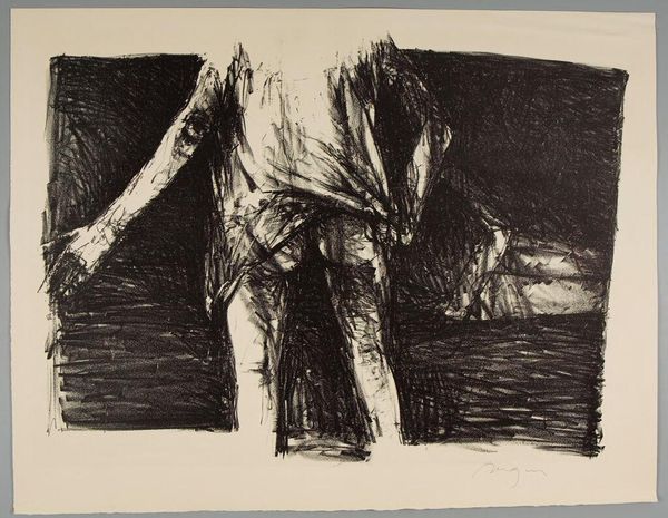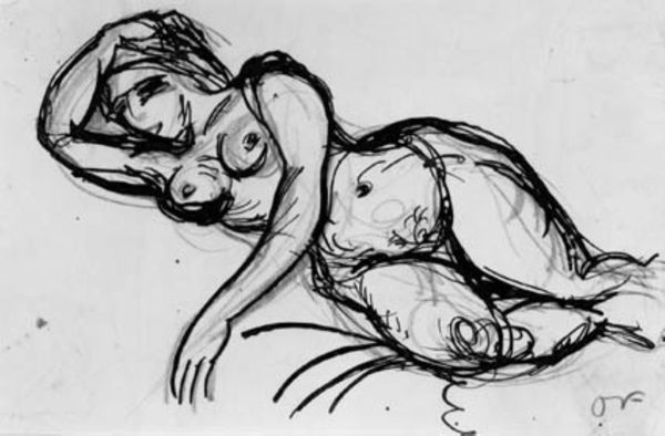 Curator: Looking at Otto Mueller’s drawing, titled "Girl at a Lounger," one immediately notes its delicate yet bold use of ink on paper. There's a striking tension between the visible texture of the materials and the apparent fragility of the scene. Editor: I am immediately struck by the pose, isn't it fascinating? The young woman seems both vulnerable and defiant in her repose. Her relaxed state makes me question the circumstances of her depiction: who is she, and what is her relationship to the artist? Curator: That reading absolutely resonates. Thinking materially, it is worth noting the stark contrast of light and dark achieved through pen and ink that Mueller is employing. Consider how such readily available materials grant access to art-making practices while still carrying the possibility to become celebrated. Editor: True. And how does the medium shape our reading of the female figure? Her body appears in stark contrast, vulnerable yet perhaps suggesting social critique by offering insight into representation and objectification. There’s almost a raw honesty in the lines. It's hard to ignore the underlying currents of gender politics at play in portraying the nude female figure in this historical moment. Curator: Absolutely. And from a materials perspective, the apparent quickness of the work, seen in its sketch-like quality, might relate to artistic values of spontaneity. In comparison with slower more laborious works, we might read "Girl at a Lounger" as valuing labor but rejecting tedious production in favor of immediate artistic freedom. Editor: I think that’s well observed. And isn't it interesting to consider how an artwork ostensibly depicting female vulnerability becomes, upon closer consideration, such a strong statement about the power dynamics inherent in representation? Her pose almost mocks a typical reclined nude by, seemingly challenging societal expectations placed on women and their bodies, refusing to adhere to the male gaze. Curator: This close look certainly brings to light questions about accessibility, the labor of art production, and gendered societal values embedded within representations. Thanks for drawing that out. Editor: Thanks to you, I see new layers to how even a drawing engages in discourses about agency, identity and the social politics that come into play as she interacts with us from across history.