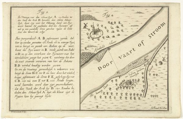 This is Martinus Berkenboom’s undated map, "Plattegrond van een bocht in een rivier met het begin van een schaardijk", made using engraving. During the early 18th century in the Netherlands, there was significant investment in cartography, driven by the need for accurate surveys for land management and military strategy. Berkenboom's map reflects this era of meticulous documentation. It uses precise measurements and geometrical principles to depict the landscape. As such, it embodies a distinctly rational and empirical approach to understanding and representing the world. However, there is also a human element to this map. Beyond its technical purpose, this piece also illustrates the complex relationship between the Dutch people and their environment. With much of the Netherlands lying below sea level, land reclamation and water management were crucial. The "schaardijk," a type of dike, symbolizes an ongoing struggle to control and reshape nature. This map also encapsulates an element of vulnerability. Despite the Dutch’s engineering prowess, the ever-present threat of flooding loomed large, creating a sense of collective identity forged through shared experience. The map, then, is not merely a technical drawing, but a cultural artifact reflecting a society grappling with its natural surroundings.