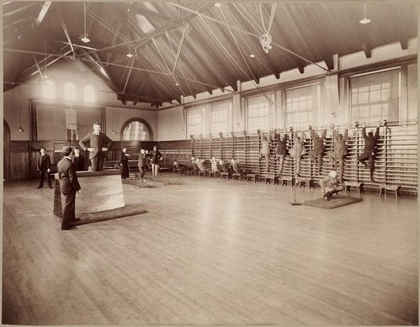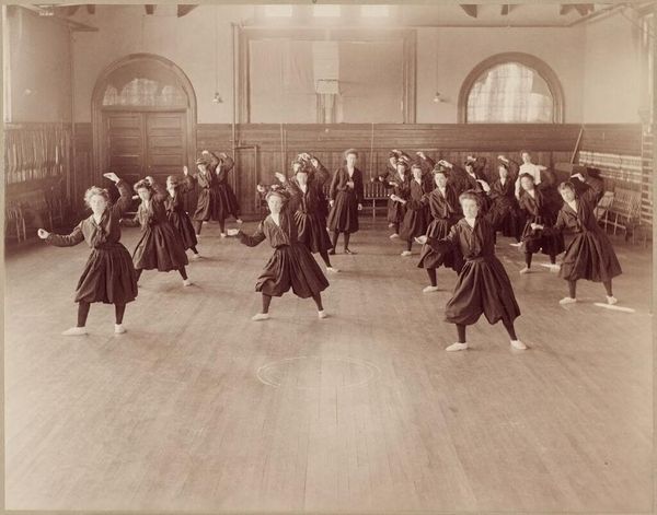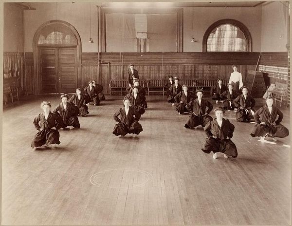 Editor: This photograph, by William A. Webster, is titled "Defectives, Feeble-minded: United States. Massachusetts. Waverly. School for Feeble-minded: Massachusetts School for the Feeble-Minded.: Side Falling Position." It shows a group of young men doing push-ups in a gymnasium. I find the composition quite stark. What do you make of the formal elements? Curator: The starkness arises from the photograph's tonal range and the subjects' regimented arrangement. Consider the light, how it illuminates the subjects uniformly, minimizing shadows. What does this uniformity suggest to you? Editor: Perhaps a lack of individuality or a focus on conformity? Curator: Precisely. Furthermore, observe the subjects' identical poses and attire. This repetition creates a visual rhythm, yet also a sense of constraint. The receding lines of the floor draw the eye, emphasizing the depth of the space and the seemingly endless repetition of the figures. Editor: I see what you mean. The formal aspects really underscore the institutional nature of the scene. Thank you, this has been enlightening. Curator: Indeed. By analyzing the composition, light, and form, we gain insight into the work's deeper meaning.