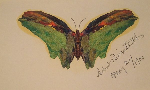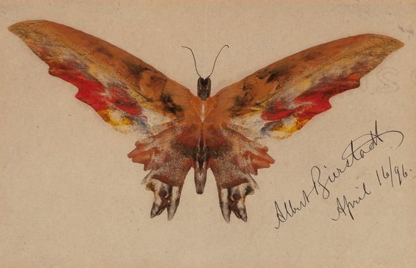 Curator: Up next we have "Yellow Butterfly" dating to around 1890 by Albert Bierstadt. It is rendered in watercolor. Editor: My initial reaction is a sense of freedom and fluidity, achieved through the delicate washes and blending of color. The symmetry, or near symmetry, is also striking. Curator: Bierstadt, of course, is largely known for his grand, sweeping landscapes of the American West, works that visually supported the idea of Manifest Destiny. This watercolor marks a very interesting contrast. Editor: It's a real departure. We see how he uses the watercolor medium to suggest texture and form through subtle gradations. I find myself drawn to the layering of color – the yellows and reds that merge to create the illusion of sunlight on the butterfly's wings. Curator: Certainly, in Bierstadt's time, there was a growing interest in scientific illustration, with artists rendering flora and fauna with accuracy. This study may be tied into larger patterns of increased industrialization and a growing public desire to categorize the natural world around them. Editor: Perhaps, but it goes beyond mere documentation. The fluidity, the blurred lines – they give a sense of life and movement that’s hard to capture with strict realism. There’s something evocative about the use of light and color. It suggests the ephemeral beauty of the natural world. Curator: Absolutely, even in this work's seeming simplicity, one can explore the prevailing interest in landscape and nature—but distilled here in miniature, away from the artist's typically grander public facing exhibition painting. It speaks to artistic flexibility and a sensitivity beyond grandiose statements. Editor: Indeed. It prompts me to consider how much we often confine artists to a single definition. This work is a refreshing challenge. Curator: It highlights how context changes the reception. Viewing this through a different lens has opened avenues for further interpretation for me, personally. Thank you.