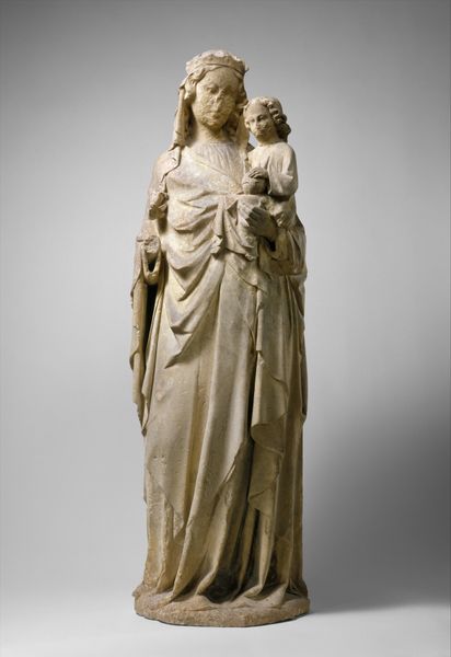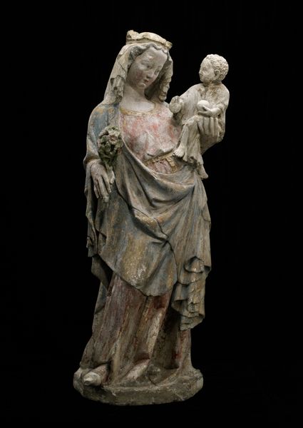 Curator: This artwork, crafted sometime between 1437 and 1443, is titled "Standing Virgin and Child" and it comes to us from the Circle of Jakob Kaschauer. The sculpture, made of wood, currently resides at the Metropolitan Museum of Art. Editor: The piece strikes me as serene, but also weighty. The folds in the Virgin's robes create this cascading effect, which emphasizes her verticality but, simultaneously, anchors her to the ground. Curator: Absolutely. And contextually, sculptures of the Virgin and Child served multifaceted roles in late medieval society. Beyond their religious symbolism, they served as powerful embodiments of maternal love and divine authority during a period defined by immense political, social, and religious change. The Virgin as an intercessor was crucial to medieval spirituality. Editor: Note the artist's attention to detail in the drapery; each fold meticulously carved. I'm interested in the use of color here. There are hints of blue beneath the gold, and these choices surely contribute to the piece’s overall expressiveness. The textures seem so palpable. Curator: Indeed. The color palette used in the sculpture—while somewhat faded with time—offers insights into the prevalent artistic tastes and symbolisms of the late Gothic period. It reflected the evolving status of the Church, as well as the changing role of women in society during that time. It's hard to imagine the social stratification without contemplating a figure like the Madonna. Editor: From a formal standpoint, the figure embodies classic Gothic conventions, from the slightly elongated proportions to the gentle S-curve of the body. Yet there's a human tenderness present. That contributes to its immediate appeal. Curator: The enduring power of art lies, perhaps, in its capacity to be reimagined and recontextualized by different eras and societies. "Standing Virgin and Child" isn't just an artwork; it’s a mirror reflecting the shifting beliefs and norms that have defined our collective human experience. Editor: Yes, and analyzing elements like line and form offer direct insight into how art shapes perception. What better demonstration than the sculpture we have contemplated today?