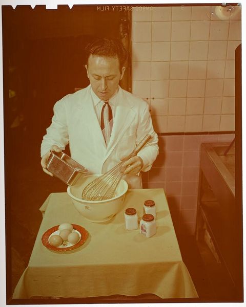 Editor: This small photograph by Jack Gould shows a chef preparing food. It feels very domestic, but also a bit staged, like a scene from a commercial. What do you see in this piece? Curator: It's interesting you mention "staged." This image invites us to consider the labor, often gendered, behind food preparation. Who is this chef, and for whom are they cooking? The mid-century aesthetic hints at societal expectations of domesticity, perhaps critiquing the invisible work historically performed by women. Editor: So, you're saying it's more than just a snapshot of cooking? Curator: Precisely. It prompts us to question the power dynamics embedded in everyday activities, highlighting the social and political dimensions of even the simplest tasks. Editor: I see it now. It's like the photograph asks us to consider the history of labor behind the image. Curator: Exactly! It encourages a critical look at the intersection of food, labor, and societal expectations.