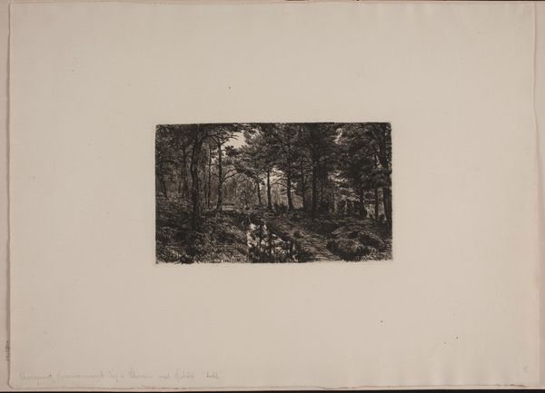 Editor: We're looking at "Wandelaar met zijn hond in het bos" or "Wanderer with his dog in the forest" by Karl Buchholz, an etching made in 1888. The limited palette gives it an austere mood, almost desolate. What strikes you about this work? Curator: What stands out to me is the labor-intensive process of etching used to depict this forest scene. Think about the tools, the acid, the meticulous work required to create this image. Doesn't this method itself become part of the art's meaning? Editor: I see your point! It definitely makes me think about the time and effort involved, and perhaps how that translates into value, or even comments on industrialization. Curator: Precisely. Consider the paper too. Its production is directly linked to deforestation and industrial growth, themes juxtaposed here by depicting a natural landscape. What does the choice of materials communicate to you? Editor: It almost feels contradictory, like nature being captured using methods that also exploit it. The commercial availability of paper and etching must have impacted the accessibility and consumption of art. Curator: Absolutely. This artwork transcends a simple landscape, revealing how its creation reflects the complex interplay of materials, production, and cultural values during that time. Editor: Thinking about the artwork through that lens really makes me appreciate the connection between materials and meaning. Thank you for sharing your insight! Curator: My pleasure! Considering these elements opens a richer understanding.