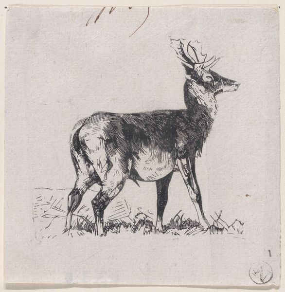 Johannes Tavenraat made this drawing of a deer with pen in gray ink on paper. The ink is applied in light washes and confident lines, capturing the movement and form of the animal. The choice of materials and process speaks to a tradition of sketching and draftsmanship, with close attention to detail and to recording observations from life. Ink on paper is a relatively accessible and portable medium, well-suited to capturing fleeting moments and preliminary ideas. The drawing is a study of form and movement, with the artist using the fluidity of ink to create a sense of vitality and energy. The thin paper support suggests this was intended as a study. This drawing shows that a lot of thought went into portraying the animal. This piece blurs the boundaries between fine art and craft traditions of natural history illustration and scientific observation.