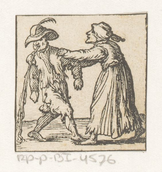 Curator: This intriguing sketch, dating from between 1673 and 1721, is by Jan Vincentsz. van der Vinne. It’s entitled "Twee staande heren in zware mantels"—"Two Standing Gentlemen in Heavy Coats"—and rendered in pen, coloured pencil and watercolor. Editor: My immediate impression is one of weightiness. Those cloaks appear incredibly heavy and the linework certainly conveys that. But, I’m also drawn to the suggestion of wealth and status inherent in the scene. Curator: Indeed, the work prompts questions about how identity and status were performed through attire during this era. The weight of their coats mirrors the weight of their social positions, especially when considering Dutch sumptuary laws of the time that attempted to regulate and thus emphasize clothing's relationship with class. Editor: Exactly. And it's important to consider the materiality here, too. These aren't quick studies, but deliberate drawings employing specific types of pen and even color that suggests value. Who had access to such materials, and what did that access signify? The drawing itself becomes a display of certain privileges and artisanal labor. Curator: Right, the layering of medium speaks to careful consideration about material culture, but if we consider the performative act of displaying social capital in Holland, during that specific timeframe, do these two gentlemen participate to some form of patriarchal and bourgeois enforcement? The genre, style, clothing, everything seems to converge. Editor: Possibly. But look closely at the slight sketchiness of their figures. Are we also seeing an emerging tension between traditional portraiture, material status, and the rapidly developing merchant class of the Netherlands, the rise of capitalist social hierarchy and perhaps these two characters have nothing, after all, but clothing as means of projecting status? Curator: That's fascinating – how the sketch captures the shifting ground of social identities! Looking at Van der Vinne’s figures now, they also represent an intimate lens into Baroque aesthetic ideals about manhood that are inextricably linked to gendered class structure. Editor: This brief examination just demonstrates that the social reality around the drawing—the making, materials, display—intersect and offer so much insight beyond just aesthetic preferences and taste making. Curator: Agreed. It underscores how deeply material and social history can intersect through a simple genre painting such as this one, giving contemporary theory space to breathe.