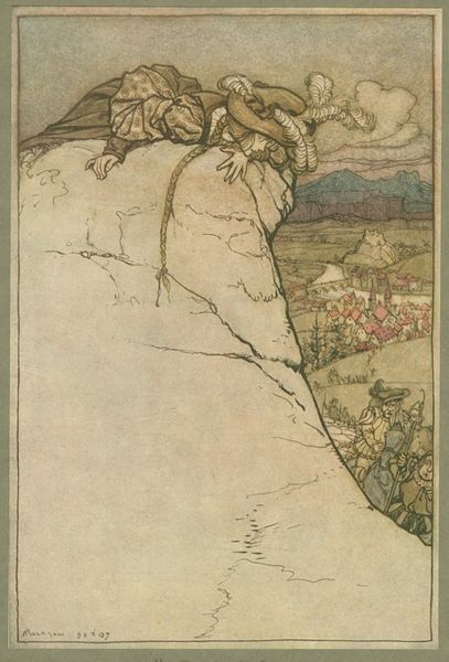 Editor: We are looking at "Mother Goose," an ink, coloured-pencil and watercolor drawing by Arthur Rackham. It looks like a scene from a fairy tale, with very soft coloring and a lot of detailed characters, but the figures seem almost nightmarish instead of sweet. How do you interpret the structure and imagery of this artwork? Curator: Indeed. The linear quality, established primarily via the ink medium, defines the narrative. Note how the composition is split horizontally. Below, the architecture and huddled figures provide a grounded counterpoint to the swirling, chaotic scene above. Consider how Rackham uses color: muted tones that allow the intricate lines to command our attention, pushing the eye upwards. Observe the textures, created via the build up of watercolour washes. This textural variation within a limited palette is crucial to the image’s overall dynamic tension. Editor: So the form emphasizes a sort of… conflict between order and chaos? The bottom feels very ordered, and the top seems uncontrolled! Curator: Precisely. Think of semiotics: What meanings do the specific forms – the tower versus the chaotic clouds – and their arrangement convey to you? Editor: The tower suggests stability. The clouds above, instability. This reminds me that fairy tales are not just for children, as the story and images present anxieties. It looks to me like the overall organization suggests visual story-telling is central. I’m seeing so much in this layered narrative after discussing it with you. Curator: Yes, consider also the interplay between the detail of line and the flatness of colour. Through formal analysis, the narrative comes alive. I learned more myself today.