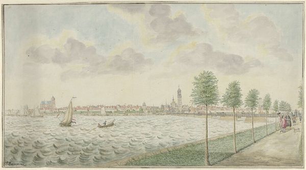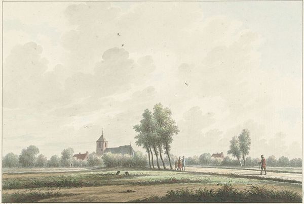 Curator: Looking at "The Ferry House on the Lek near Schoonhoven," done between 1761 and 1828, what's your first reaction? I always think of summer afternoons when I see this. Editor: The subdued color palette and gentle lines immediately evoke a sense of quiet contemplation. The artist really captured the atmosphere of the wetlands. There's an undercurrent here, though... of something lost, maybe? A pastoral idyll tinged with melancholic resignation. Curator: Oh, resignation! I think the artist is being romantic. There are farmers along the Lek River tending to the herds, which certainly conveys life as the ferry carries them along their way. It's simple; watercolor captures the calm beauty that permeates. What are your thoughts about that? Editor: Calm, sure. But even the sheep in the foreground appear burdened somehow. The river itself is a potent symbol: the waterway linking one place to another and an artery connecting people to their landscapes. The church steeple in the background, though... does that feel like a silent, looming figure? A reminder of greater moral, ethical implications for society? Curator: (Chuckles) A looming figure? I thought it signaled safety! Although your "burdened" take makes me re-think it... I guess symbols transform based on one’s perspective! Looking closely at the materials—the use of watercolor—allows such gentle depiction. Do you think there's symbolism within this medium too, perhaps reflecting fragility? Editor: Absolutely. The translucence of watercolor mimics the elusive, ephemeral nature of memory itself. These scenes are impressions as much as depictions. In the broader tradition, landscape paintings in this period become increasingly self-aware about what and how they show the relation of people to places. This painting marks that tradition with understated style. Curator: I will see this pastoral landscape painting with fresh eyes next time. Thank you, really! The romantic scene will have the undercurrent of memory as the image transforms. Editor: And hopefully the silent church keeps singing! This one contains so many layers once you peer into it. I loved this.