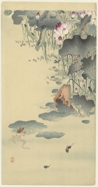 Curator: Right now we’re looking at “Geese on the Bank” by Ohara Koson, likely created sometime between 1900 and 1930. The piece, executed in watercolor, exemplifies the ukiyo-e style. Editor: It's immediately striking – the almost stark contrast of the geese against the water. There's a simplicity, almost a haiku in visual form, and a calming, reflective mood. Curator: Yes, it resonates with that quiet, introspective mood often associated with ukiyo-e. But beyond the aesthetic, it’s worth thinking about what geese represented during that era. Consider the social context. Were these seen as symbols of prosperity, or something else entirely? Editor: Traditionally, in many cultures, birds in general are messengers, bridging the earthly and spiritual realms. And geese specifically, because of their migratory patterns, could represent perseverance, navigation, even community. The pair here… there's a sense of interdependence. Curator: Exactly. And consider the gaze of the lower goose – almost searching. This raises broader questions about environmental representation within art. To what extent is the artist aware of—and responding to—contemporary shifts in attitudes toward the natural world and our interaction with animals? Editor: That subtle ripple effect the artist captures… the goose barely touching the water, yet the impact is clear. Water as a symbol of change, of the subconscious. It mirrors the animal's interior state and becomes a symbolic representation of human experience. The gray wash seems to mirror uncertainty too, what do you make of that? Curator: Yes, there is definitely a sense of transience suggested here by that restrained palette, which perhaps lends itself to broader narratives around shifting social and political landscapes prevalent in early twentieth century Japan. This period experienced growing Western influences challenging long-held artistic and cultural traditions. Editor: I see the delicate, symbolic language so clearly now! It makes the piece richer, knowing Koson subtly reflected his time in an image as ostensibly simple as two geese drinking. Curator: Absolutely. Considering both form and cultural context allows for richer dialogues about the image's resonance through time. Editor: Indeed, that initial feeling of serenity shifts towards something much deeper, prompting one to consider ideas related to animal and environmental change.