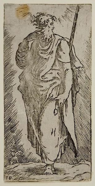 Curator: Here we have Rembrandt van Rijn's etching, "Old Beggar Woman with a Gourd." It's a small work, only about 4 by 2 inches. Editor: It feels heavy, though. She's stooped, burdened—and the cross-hatching really emphasizes the weight of her clothes, the density of her situation. Curator: Rembrandt was fascinated by the margins of society. Prints like this were relatively inexpensive and circulated widely. They shaped public perception of poverty. Editor: I love that gourd hanging off her back—it’s almost like another head, a second burden of need. Curator: Indeed. It humanizes her, showing that even in destitution, there are needs and stories carried along. Editor: Makes you wonder about the stories etched onto her face, the landscape of hardship. I’m grateful the image lingers with me.