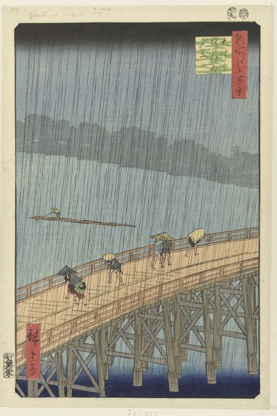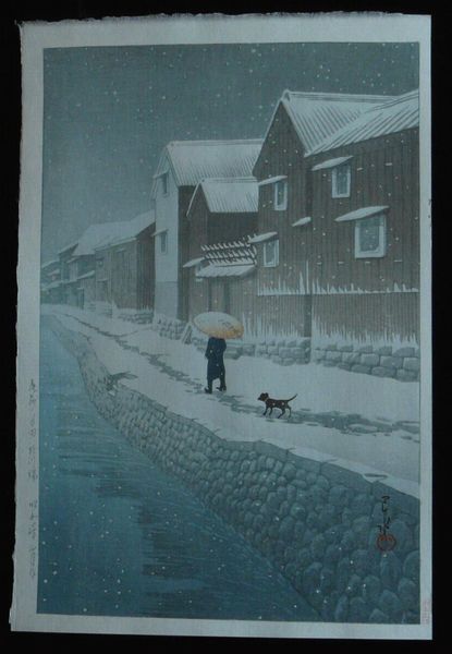 "Night Rain at Kawarako, Ibaraki" is a woodblock print by Hasui Kawase. It belongs to the Shin-Hanga movement of the early 20th century, which revitalized traditional Japanese art by incorporating Western elements. Here, we see a quiet townscape rendered in shades of blue, gray, and the soft, inviting yellows from lit windows. The rain blurs the edges of the buildings, creating a melancholic mood. Kawase's work often evokes a sense of nostalgia for a disappearing Japan, one where the past and the present intersect. The lone boat resting by the shore suggests themes of solitude. This image invites contemplation on the relationship between humanity and the natural world. The way Kawase captures the emotional weight of a simple scene makes you reflect on your own place in the world. It encourages us to find beauty in the quiet moments of everyday life."
