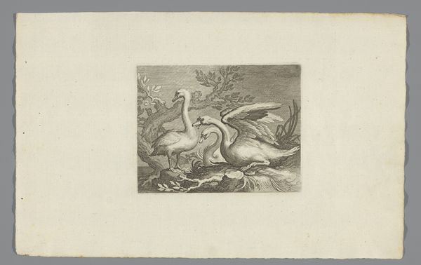 Jean Leclerc created this print, "Two Swans and Their Young," sometime in the late 16th or early 17th century. During this era, the Dutch Republic was asserting its independence, and art often reflected themes of national identity, family, and morality. Here, Leclerc presents a serene, familial tableau. Swans, traditionally symbols of grace and purity, are shown with their offspring, evoking ideas of domesticity. The image exists within the context of early modern Europe, where social structures were patriarchal, and family lineage was important. Leclerc subtly critiques these traditional representations by placing the swans in a natural setting, detached from the courtly settings usually associated with them. The emotional depth of the artwork is present in the swans' protective postures, inviting reflection on the complex dynamics within the animal kingdom, mirrored in human society. Leclerc uses the print to explore themes of family, nature, and perhaps even an understated critique of societal norms.