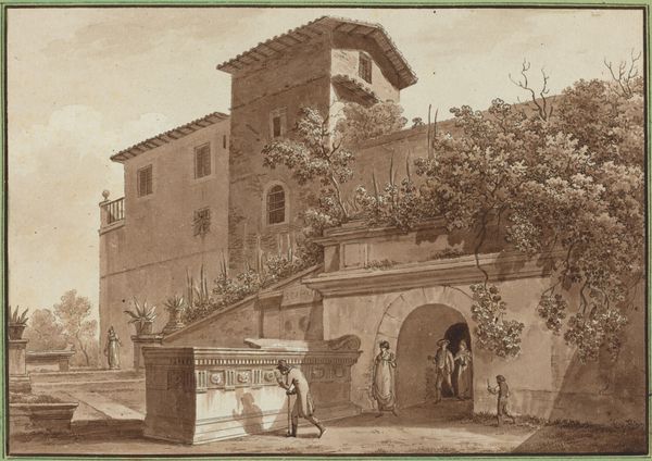 Editor: Here we have Fritz Petzholdt's "Raffaels atelier i Villa Borgheses have. Rom", created between 1805 and 1838, a plein-air drawing rendered in watercolor and colored pencil. I find the scene very tranquil. The muted tones create a sense of peace. How do you see this artwork, considering its historical context? Curator: This watercolor offers a glimpse into the romantic fascination with Italy and its artistic heritage, particularly Rome, which became a crucial destination and source of inspiration for artists. It wasn't just about admiring Renaissance masters, but about embedding oneself within a history, appropriating, even re-imagining it. Editor: Re-imagining, how so? Curator: Well, consider Villa Borghese itself. It wasn't simply a backdrop; it was a symbol of artistic patronage and classical ideals. By depicting it, Petzholdt situates himself and his artistic project within that lineage, asserting a continuity while also interpreting it for a new, burgeoning national romantic audience back in Denmark. The very act of drawing 'en plein air' signifies a new relationship to nature, filtering even established structures through that lens. Do you see how the drawing almost romanticizes architecture and its context? Editor: I see that. There is that connection to nature. How does that trend reflect artistic intentions during that period? Curator: It represents a broader shift where the immediacy of experience, conveyed through plein air work, began to carry increasing cultural and artistic value. This contrasted to academic history painting and contributed to democratizing artistic practice and the viewing of art. Editor: That is a big shift to focus on nature and the immediacy of experience instead of tradition. Curator: Indeed. Artists like Petzholdt participated in shaping the visual language of their time, influenced by emerging socio-political and institutional contexts. Think of the growing importance of art academies and public exhibitions at the time and who would be the target for the work to resonate with. Editor: I see! Thank you; that contextual backdrop has provided a deeper understanding.