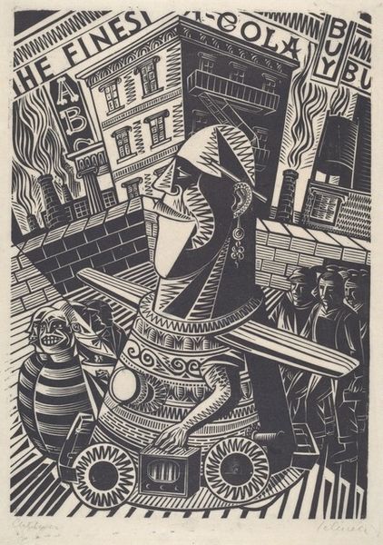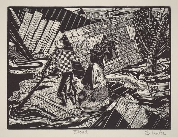 Editor: Here we have Charles Turzak's "Chicago Snow Storm," a woodcut print from around 1935. The high contrast between black and white is quite striking, and the exaggerated perspective really amplifies the feeling of labor. What can you tell me about it? Curator: It's compelling to see how Turzak transforms a fairly mundane task – clearing snow – into something monumental through the sheer act of representation and production. Notice how the woodcut medium itself lends to the rawness of the scene, emphasizing the physical labor involved in both the artwork and the subject. Do you think the material contributes to a specific narrative? Editor: I suppose the starkness and physicality of the woodcut underscore the harsh realities faced by laborers, particularly during the Depression era. It removes any romanticism. Curator: Precisely. And consider the social context: during the 1930s, the means of production, labor rights, and class consciousness were heavily debated. Turzak, by choosing a working-class subject and portraying it through a readily accessible medium like printmaking, is potentially democratizing art. The material speaks directly to a working-class audience. Editor: That makes me think about how this artwork wouldn’t necessarily be considered 'high art' at the time. Its value lay in its relatability, its commentary on society, rather than purely aesthetic appeal. Curator: Absolutely. And that challenges the very definition of art! It encourages us to rethink traditional art boundaries and how they relate to class, labour, and access to creative resources. Editor: It really shifts my understanding of the artwork! I originally just saw a scene, but now I'm seeing a whole history embedded in the process and materials used. Curator: Indeed. It shows the artwork less as a static object and more as a reflection of its production.