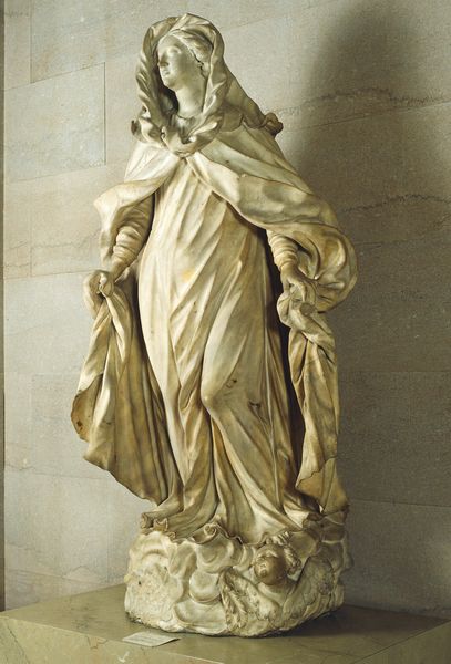 Editor: Here we have Michelangelo's marble sculpture, "St. Peter", created in 1504, and currently residing in the Duomo di Siena in Italy. I'm immediately struck by the somewhat burdened expression and pose – it doesn’t feel like a triumphant depiction. What do you see in this piece? Curator: The interesting thing here is to consider not only the artistry of Michelangelo, but the *patronage*. This work exists in a very specific socio-political environment. The Duomo was not simply a place of worship; it was a powerful symbol of civic pride and a demonstration of wealth and influence for Siena. So, to place this sculpture within this niche was a highly political act. Editor: How so? Curator: Ask yourself: What does it mean to place St. Peter, one of the most important figures in Christianity, in *this* particular Duomo, *at this moment* in history? Whose agenda is being served? Are we seeing religious devotion, civic boosterism, or perhaps a statement about Papal authority? Editor: That’s a totally different perspective than I was anticipating. I was thinking mostly about art for art's sake. I guess that’s a naïve perspective, thinking about the art market in our time versus the Italian Renaissance! Curator: Not naive, just different! Understanding art is always about layering perspectives. By considering the forces that shaped its creation and reception, we gain a richer understanding of its meaning and impact. Remember the institution always plays a huge part in dictating artistic interpretation. What is clear from the historical literature, we might not call it propaganda in the traditional form but art definitely supported hegemonic dominance and beliefs! Editor: Right. Now I can't unsee all the layers! The art itself is only one piece of it. Curator: Precisely. Seeing is more than meets the eye.