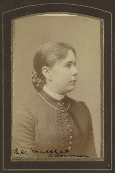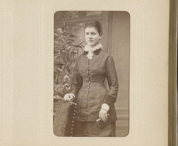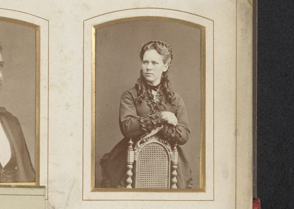 Adolphe Zimmermans captured this small portrait of an unknown woman using photography. The sepia tones and intimate scale lend a sense of historical distance and personal connection. The sitter is positioned centrally, with her hands resting gently on the back of a chair, creating a stable, almost architectural base for the composition. The artist directs our attention to the texture of the sitter’s garments. Lace and ruffled sleeves contrast with the smooth fabric of her jacket, inviting a tactile sense of the materials. The overall composition plays with formal contrasts: light and shadow, soft curves and structured lines. Consider the way the photographer uses the interplay of light to sculpt the sitter's face. These aesthetic choices invite reflection on how the photographic medium represents identity and being. The use of formal elements such as contrast and texture invites ongoing interpretation, emphasizing that images are not just records but active participants in shaping our understanding.