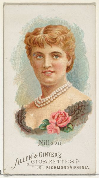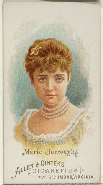 Editor: So this is "Mrs. James Brown Potter" from the World's Beauties series by Allen & Ginter Cigarettes, dated 1888. It's a small lithograph and the first thing that strikes me is how this delicate image of beauty was used to sell… cigarettes. How do you interpret this piece? Curator: The rose-like patterns adorning Mrs. Potter’s gown are noteworthy. In this context, roses often signify beauty, love, but also transience, reminding viewers of the fleeting nature of these qualities. The overall soft hues contribute to this impression. How might the transient nature of beauty relate to consumer culture at the time? Editor: It's interesting you mention transience because it clashes with the commercial purpose. Cigarettes are consumable goods. The portrait gives a sense of lasting elegance. The crown and necklace feel like symbols of immortality. Curator: Indeed, jewelry –especially pearls and gems– has always been closely linked to immortality. Perhaps Allen & Ginter are slyly playing on that, suggesting their cigarettes, like beauty and immortality, offer lasting pleasure, a subtle illusion through powerful symbols. Also notice the way the name "Mrs. James Brown Potter" becomes linked with Allen & Ginter, creating a new kind of fame, fueled by brand association. Do you see any tension arising from the piece being mass-produced as a commercial item but seemingly created for an individual? Editor: I see what you mean. The symbols speak of lasting value, but the item itself is inherently disposable, designed for fleeting enjoyment. So the tension lies in wanting to own this iconic beauty. Thanks for illuminating these interesting contradictions! Curator: My pleasure. Now, the layers of meaning have deepened, I hope, connecting individual desire with the larger cultural currents it embodies.