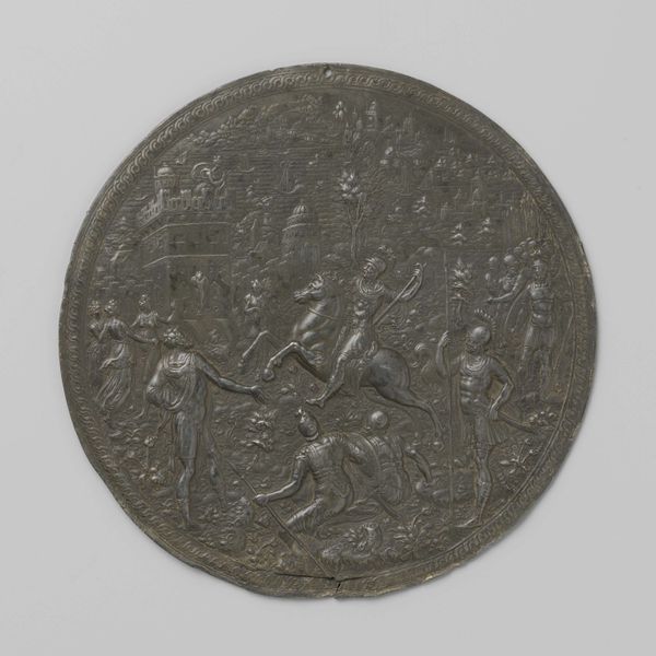 This lead roundel depicts the Germans entrenching themselves as the fleet of the Prince of Orange approaches. It was made in the Netherlands in the late 16th Century. The print conveys the political and religious turmoil of the period. The Dutch revolt against Spanish rule was in full swing, and William of Orange led the fight for independence. This piece captures a moment of military action, but it's more than just a battle scene. It's a statement about power, resistance, and the struggle for freedom. Look at the visual codes. The Germans, are shown fortifying their position, while in the background, the Prince of Orange's fleet approaches. This contrast highlights the tension and impending conflict. This imagery would have resonated deeply, fueling patriotic sentiments and bolstering the resolve to resist oppression. To truly understand this artwork, delve into the archives, explore historical accounts, and examine the visual culture of the time. Art is a product of its time and place, and the more we understand that context, the richer our appreciation becomes.