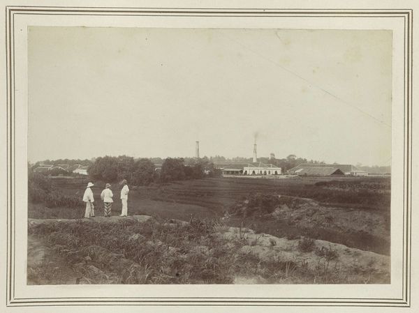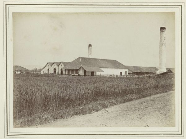 Curator: The scene before us is an 1886 photograph titled "Fabriek Beran" by Kassian Céphas, housed here at the Rijksmuseum. The albumen print captures an industrial factory complex in Indonesia. Editor: It’s remarkably bleak, isn’t it? The vast, empty foreground and the pall of smoke...it conveys a sense of desolation. Curator: Indeed. That open space speaks volumes. It places the viewer at a distance, perhaps symbolizing the social and economic distances created by this kind of industry during Dutch colonial rule. It's a carefully constructed vista, I think. Editor: Precisely. And consider the architecture—a stark contrast to the Indonesian landscape. Those smokestacks especially, belching what appears to be unrelenting plumes of progress, perhaps without much regard for consequence. How do the local communities relate to this symbol of progress? What is their perception of this image and place? Curator: A vital question to unpack. We must acknowledge Céphas’ role as court photographer in Yogyakarta, Java. His commissioned work documented many aspects of life, and this image participates in that broader context. How did colonial photographic practices impact subjectivities and power structures? What visual tropes were being normalized? Editor: Also, it makes me consider environmental racism. Who is bearing the brunt of this pollution? Does this visual evidence prompt deeper questions about environmental impact and exploitation under the guise of progress, issues that sadly persist today? Curator: It does. Thinking intersectionally, one might ask: how did race, class, and gender interact within the labor dynamics of this factory? The photograph invites speculation and historical inquiry into power structures and individual stories lost to time. Editor: It’s powerful how this relatively small, seemingly straightforward landscape photograph opens onto such expansive questions about social justice. Curator: Agreed, a silent, photographic witness to a complex past. Editor: A somber reminder of progress's shadow.