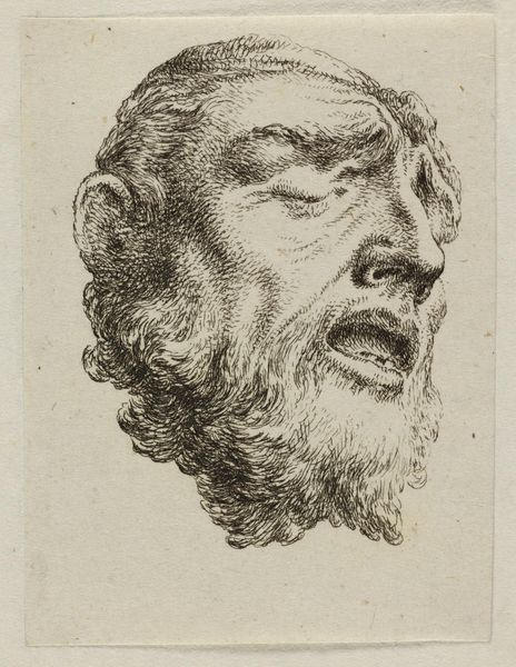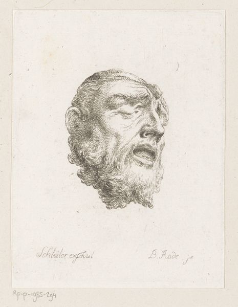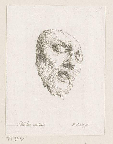 Editor: This is Christian Bernhard Rode's "Mask from the Courtyard of the Zeughaus, Berlin," a small etching. It feels intense, even grotesque. What symbols or deeper meanings do you see? Curator: Notice the closed eyes, the contorted mouth. Masks often represent hidden aspects of the self, repressed emotions. Rode's choice to depict such an expressive, even tormented face, suggests a confrontation with inner turmoil. Is it a memento mori, perhaps? Editor: That's interesting! I hadn’t considered the psychological weight of the image. Curator: Yes, and consider where it was found—the Zeughaus, an armory. Might this be a commentary on the psychological toll of war, masked behind heroism? Editor: Wow, I hadn't thought of that. Thanks for sharing your insights. Curator: It's fascinating how one image can evoke so much history and personal reflection.