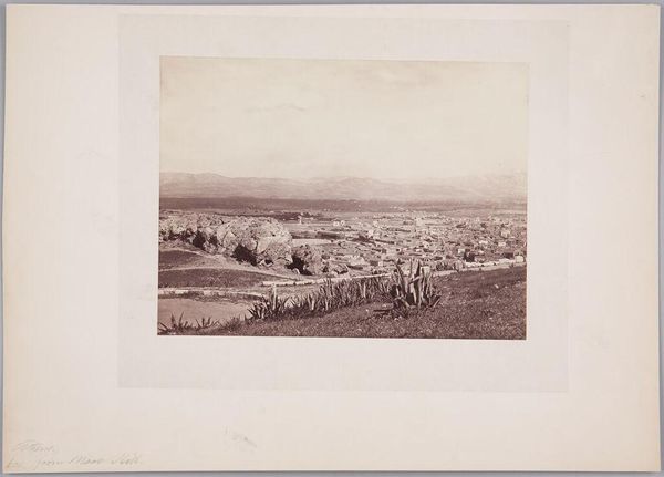 Curator: This is Francis Frith’s photograph, "Athens, the Modern City from the Acropolis." Editor: It's a striking composition—the urban sprawl laid out before us, receding into the hazy distance, with Lycabettus Hill looming. A city under watchful gaze. Curator: Frith, working in the 19th century, was fascinated by documenting places. This image captures a moment of transition, the city expanding beyond its ancient boundaries. We must consider the labor involved. Editor: The visual weight of that hill, though...it’s a primal symbol. A guardian, almost. And the city below, nestled under its protection—it speaks to a powerful sense of place and identity. Curator: Indeed, but consider the physical act of capturing such an image, the equipment, the chemicals, and the social context of documentation and representation. Editor: True, true. Still, that mountain…it’s hard to escape the symbolism. It resonates deeply. Curator: Perhaps a bit too much for me. Editor: Well, either way, it’s a fascinating window into a city then and now.