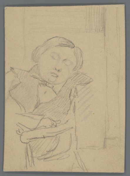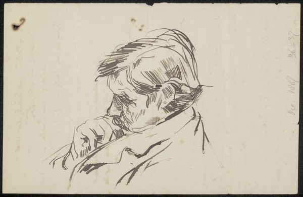 Editor: So, this is a pencil drawing from between 1900 and 1920, titled "Abraham Kuyper," and attributed to Patricq Kroon. The rough quality of the sketch gives it a spontaneous feel, like we’re looking at a page torn straight from the artist's sketchbook. What stands out to you? Curator: It feels more than spontaneous to me – there is intent! It looks almost like a caricature, wouldn't you agree? There is a bit of an edge to the hurried pencil strokes, as though Kroon aimed not only to capture a likeness of the man, Abraham Kuyper, but also something of his essence, maybe even a bit of his…character. Editor: A caricature! I can totally see that, now that you mention it. The exaggerated features… So, do you think the artist was trying to make a statement about Kuyper? What *was* Kuyper known for anyway? Curator: Well, I imagine Kroon knew more than I, or perhaps you, will ever know. Kuyper was quite an important figure, a Dutch theologian and statesman. But regardless of who the sitter was, you almost get the feeling that this sketch is meant to be a record of the artist’s instantaneous *feeling* about a person, rather than a meticulously crafted likeness. The hat is great, a quirky touch, but…is he scowling at something in his hand, perhaps? Editor: He does look rather intense! It's funny how a simple sketch can convey so much. Thanks! Curator: My pleasure, it's like peeking over an artist’s shoulder to get at how a moment made them feel. Wonderful.
