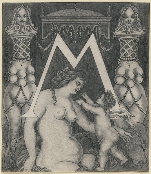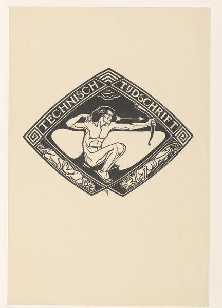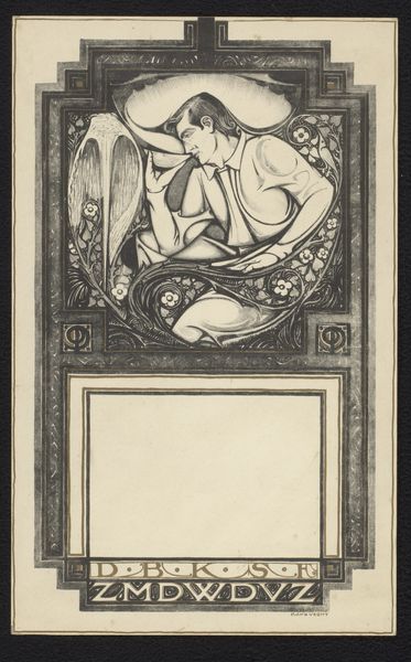 Editor: This print, "In dank en vriendschap aan Roland Holst," likely created between 1910 and 1926 by Jac Jongert, employs a combination of techniques like etching, linocut, and pen drawing. The nude figure within the ornate frame creates a somewhat unsettling yet intriguing effect. What do you see in this piece? Curator: I see a powerful symbolic representation of the emerging proletariat. Jongert dedicates the image to Roland Holst, likely praising Holst’s commitment to socialist ideals. How does the artist frame his activism? Editor: The ornate frame, juxtaposed with the raw nudity, seems intentionally provocative, as if challenging societal norms around the body and class. It’s dedicated to a friend, so the personal and political seem linked. Curator: Precisely. Consider how the inscription frames Holst as someone who reveals “the awakening proletariat,” it links intellectual labor with the burgeoning power of the working class. How do the visual and textual elements interact in communicating Jongert’s social message? Editor: The flowing text intertwined with the imagery definitely gives the sense of an awakening, a rising consciousness. I hadn’t considered the intertwining of image and word, that is interesting! Curator: Thinking about that interplay reveals Jongert's awareness of art's potential as a tool for social commentary. Did anything surprise you about this artwork? Editor: Yes, I initially focused on the artistic style without fully appreciating its activist intent. It's a good reminder to consider the artist's message beyond the surface aesthetics.