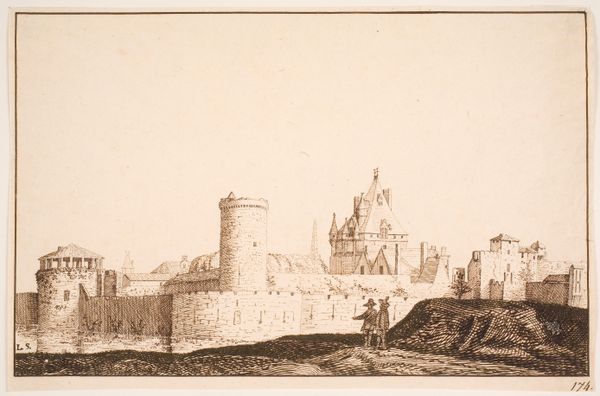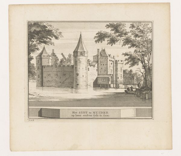 Editor: Here we have "Reproductie van een tekening van Huis Warmond," or Reproduction of a Drawing of Warmond House, which the museum estimates was created sometime between 1875 and 1950, and signed "W. Versluys". It's a pencil drawing, and it evokes a feeling of serene solidity, like the castle has stood the test of time. The balance in the composition is very noticeable. What stands out to you? Curator: Immediately, the formal properties establish a visual hierarchy. The artist employed linear perspective to create depth, but note how the even distribution of light flattens the image, preventing true recession. The texture achieved with varying pencil strokes also contributes to this tension between depth and surface. Observe how the geometric shapes--the towers, the walls, the gate--are meticulously rendered. Editor: So, you're focusing on the formal components rather than, say, the historical relevance of the house? Curator: Precisely. My inquiry centers on the intrinsic artistic elements. Consider the careful arrangement of vertical and horizontal lines. What does that evoke for you? Editor: Well, the verticality of the towers definitely emphasizes their height, but then the horizontal lines of the walls create a sense of stability. It's like a visual push and pull. Curator: Exactly! The artist plays with these oppositions, creating a balanced composition that is also somewhat unsettling. The lack of human presence further amplifies this sense of detached observation, almost as if we're viewing an idealized architectural form. Editor: That's a fresh perspective! I was initially drawn to the peacefulness, but now I see the tension created by the almost clinical observation and the push-and-pull of the line work. Curator: Exploring such tensions are inherent to appreciating a drawing like this; by appreciating how line, tone, and composition contribute to the overall impact of the work we move beyond simple representation.