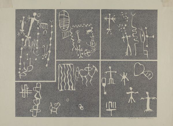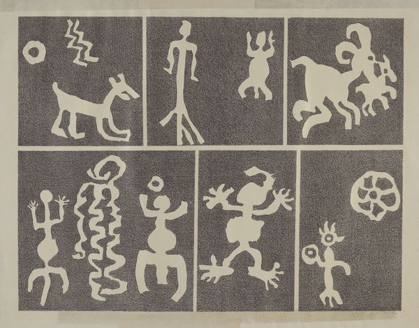 Lala Eve Rivol made this piece, "Petroglyph," using what looks like cut paper or stencils to create these ghostly white figures against a grey ground. It's like she's pulled these ancient symbols right off a rock face and given them a new life. I'm really drawn to the way she’s arranged the elements – the little parade of animals at the top, the dancing figures, and those mysterious, star-like shapes. There’s a tactile quality, a simplicity, which reminds us of the directness of folk art. You can almost feel her hands at work, carefully placing each shape. Look at the way the figures are simplified – they are reduced to their essential forms. They have this naive quality that's both charming and powerful, echoing artists like Miró or Klee, who were also inspired by ancient and "primitive" art. This piece shows that art is really just an ongoing conversation with the past.