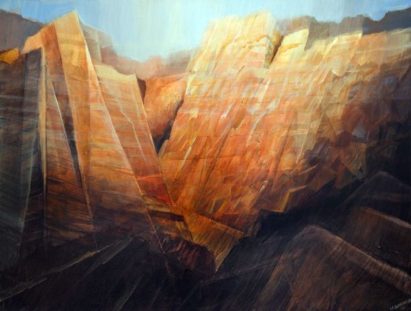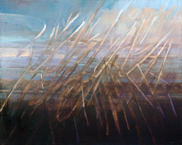 Rochelle Blumenfeld’s 'Beacon' is a painting of indeterminate date, where you can see the ghost of the process. It's like the painting came into being by itself. The paint is layered, almost translucent in places, giving it a feeling of depth. There’s this dance between light and shadow, warm and cool colors. See how the lines aren't quite straight and the shapes are a bit wonky? It reminds me of Richard Diebenkorn’s 'Ocean Park' series, where the grid becomes a way to explore color and space, but here in 'Beacon' it's less structured. There's an area, right in the center, where the colors intensify, where you can see a build up of marks, like a palimpsest of gestures. I like that it doesn't give you all the answers, that it leaves room for doubt, for multiple readings.