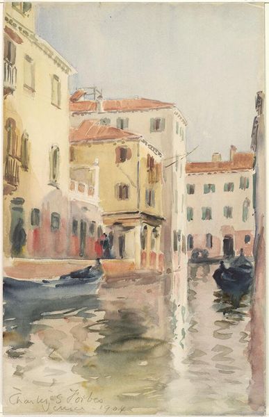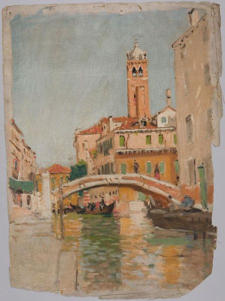 Editor: Here we have Denman Waldo Ross's "Canal Scene," painted with oil on canvas. It captures a Venetian waterway, and I’m struck by how dreamlike the colors are, soft and almost faded. What story do you think this painting is trying to tell? Curator: I see a commentary on the romanticization of Venice. Ross, an American painting Venice, suggests a dialogue about cultural appropriation and the gaze. Who gets to represent this city, and what narrative are they pushing? Editor: That’s interesting. I hadn't thought about the artist’s perspective in relation to the subject. So, is it fair to say this painting is not just a landscape? Curator: Precisely. It's an intersection of identity, place, and representation, forcing us to question the power dynamics inherent in artistic expression. Perhaps Ross is intentionally softening the scene, showing us the unreality of his own vision. Editor: I see. Thanks, that gives me a whole new perspective on how to view this work! Curator: Indeed, let's remember that art is rarely just about what's on the surface. It is about the artist, the context, and the viewer.