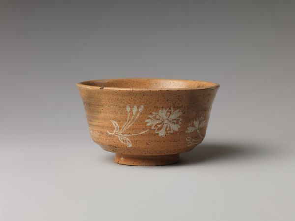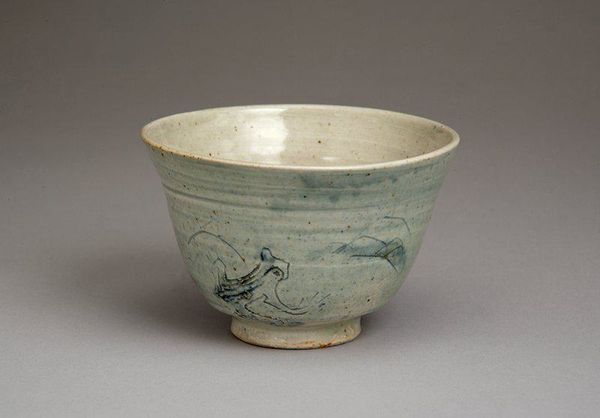 Curator: I'm immediately drawn to the quietness of this piece, almost monastic in its simplicity. It's a teabowl with an autumn poem, made sometime between 1850 and 1899 by Eiraku Wazen. The ceramic is so tactile; I can almost feel the rough texture in my hands. What do you see? Editor: Well, it feels deliberately understated, yet charged. Looking at it through a postcolonial lens, I'm curious about its role, if any, in the Orientalist fantasies so common during that era. Was it made for local use, or specifically for export to the West, playing into Western stereotypes of East Asian cultures? Curator: Hmm, interesting. Though it does seem far too subtle for outright Orientalist pandering. It breathes the spirit of wabi-sabi; it embraces the imperfections. Note the calligraphy, a poem probably lamenting the ephemeral nature of autumn. There’s an acceptance of things fading, like the tea one drinks from it. Editor: Right, wabi-sabi is crucial here. That aesthetic tradition is often romanticized without acknowledging its roots in Zen Buddhism and its social context. This simplicity can be interpreted as a kind of refusal—refusing capitalist accumulation and embracing alternative, more sustainable, ways of relating to the world. It might be worth investigating the bowl's actual utility. Was it a luxury item despite its seeming austerity? Curator: Good question. And looking again at that poem, inscribed with such fluid strokes. The very act of inscription elevates the bowl, transforming utility into a contemplative object. Tea becomes ritual, not just beverage. Though maybe I'm over-romanticizing! Editor: No, but let's not forget that rituals can also be exclusive practices. Who had access to these kinds of refined objects and the leisure to perform such rituals? Thinking intersectionally reveals hierarchies, class dynamics, and social power structures at play, even within this unassuming teabowl. Curator: Yes, the question of access is important, and makes the whole sensory impact of the bowl…the quiet…the tactility…more layered. Editor: Absolutely. This simple vessel can open up conversations about trade, cultural appropriation, and the politics embedded in everyday aesthetics. A poem of autumn becomes a challenge to empire.