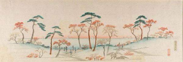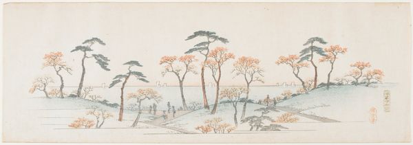 Curator: Utagawa Hiroshige's "Takata Riding Grounds" presents a subtle vista rendered in keyblock print. Editor: It feels so delicate, like a memory fading into the paper. The long, horizontal format evokes a sense of quiet expanse. Curator: Indeed. The dimensions emphasize the open riding ground, while the trees act almost as rhythmic markers along the horizon. Editor: And the figures, almost ghostly, give us a sense of the scale. I wonder, what was it like to stand there, centuries ago? What sounds, what smells? Curator: Hiroshige, who died in 1858, captures something essential about place, focusing on the composition that draws the eye through the landscape. Editor: It’s more than a landscape. It's a feeling, a fleeting moment captured with such restraint. There's a melancholic beauty in it. Curator: Precisely. It's a study of space, light, and atmosphere distilled to its essence. Editor: A gentle reminder that even in stillness, there is movement, time passing.