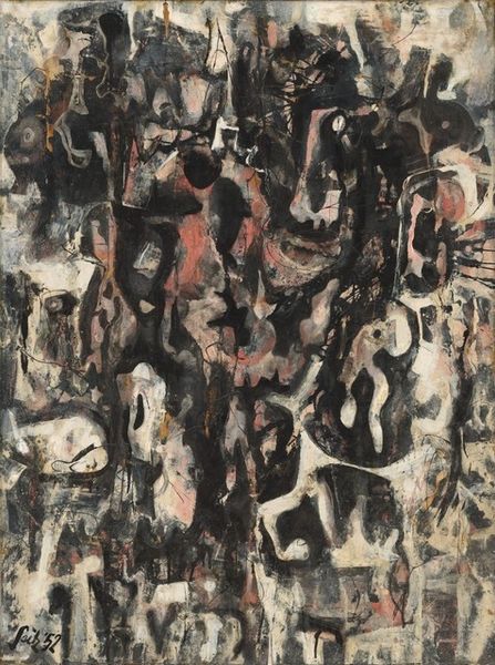 Editor: This is Behjat Sadr's "Paradis, Panel of the triptych" from 1956, created with mixed-media and impasto techniques. I find its heavy, dark strokes quite imposing, almost oppressive. How do you interpret this work? Curator: Given Sadr’s background in Iran during a period of intense political and social upheaval, this "oppressive" mood might reflect her subconscious anxieties. What appears as merely “abstract expressionism” visually also acts as an emotional record. Do you see how the monochromatic palette and thick impasto build up layers? Editor: Yes, it’s as if the paint itself is struggling, mirroring a kind of internal turmoil. Was Sadr making a direct statement with this work? Curator: Direct? Perhaps not explicitly. But artists operate within socio-political contexts, consciously or unconsciously. Think about Iran in the 1950s. Modernization efforts, Western influences, and the seeds of political dissent were all swirling. Sadr, as a modern woman artist, was undoubtedly navigating those complex currents. Is there a geometric rigidity fighting to get out? Editor: I see what you mean. Behind all the gestural strokes is an almost architectural structure buried inside. How does the title fit into this narrative? Curator: “Paradis” ironically contrasts with the somber visuals, creating tension. Perhaps it's a commentary on the idealized vision of progress clashing with the lived experience. What did you learn after analyzing all this? Editor: I initially saw only darkness and heaviness, but now understand it is charged with historical and political undercurrents relevant to the artist. It's no longer *just* abstract. Curator: Exactly. Art often functions as a register of its time, reflecting the collective anxieties and aspirations of society.