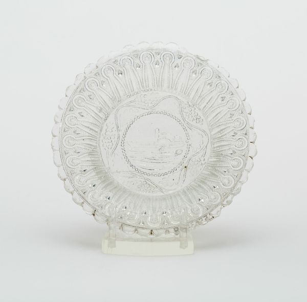 This cup plate, whose maker is unknown, resides here at the Art Institute of Chicago. Its circular form, rendered in clear glass, immediately draws us in with its intricate design. The grid pattern at the center, overlaid with delicate floral motifs, presents a study in contrasts between geometric order and organic fluidity. The scalloped edge, punctuated with evenly spaced circles, adds a playful rhythm to the plate’s structure. The transparency of the glass further complicates our perception, allowing light to filter through and cast shadows that animate the piece. We can consider this design through the lens of structuralism, noting how the regular patterns and repeated shapes create a sense of underlying order. Yet, the subtle variations within these patterns—the slight imperfections in the glass, the gentle asymmetry of the floral designs—prevent the plate from becoming a purely mechanical object. Instead, it hovers between the mass-produced and the handcrafted, questioning the boundaries between art and industry. This tension invites us to reflect on how such an object embodies the complex interplay of design, utility, and aesthetic expression.
