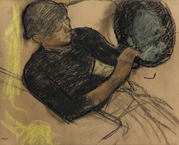 Curator: This pastel drawing by Edgar Degas, created between 1878 and 1880, is entitled "Au Café-Concert, Deux Chanteuses," which translates to "At the Café-Concert, Two Singers." Editor: Wow, there's something instantly captivating about this piece. I'm struck by the soft, almost blurry quality and the way the colors blend together. It feels dreamlike. Like I'm eavesdropping on a memory. Curator: It’s more than just a pretty picture, though. It situates itself within a much larger cultural narrative that exposes the commodification and exploitation of working-class women performers in late 19th-century Paris. The café-concert, a hub of Parisian nightlife, blurred the lines between art, commerce, and social class, simultaneously offering opportunities and preying upon women. Editor: Interesting. I’m getting a sense of their personalities. One of them looks a bit nervous; she is wringing her hands and averting her eyes, almost swallowing her spit; and the other one has a fixed stare. And, oh my, did the singer get that top on sale at a rock bottom price?! She got it. I can feel it. Curator: The deliberate artistic choice not to highlight idealised images is important. This approach challenges patriarchal social hierarchies and gender expectations that controlled the lives of women. Degas provides us with insights into the multifaceted realities, whether challenging class constraints or calling for recognition. Editor: Well, putting the theoretical aside for a moment. Those rapid strokes of blue and gold--those colors—they suggest there's a vibrancy there beneath it all, beneath whatever hardships they faced. It makes the work, if you allow me to say so, sing, don't you think? Curator: Absolutely, there’s an undeniable beauty. Considering the socio-economic context, one is faced with confronting the contradictions between female agency and constraints in artistic depiction, thereby expanding comprehension regarding the intricate relationship among the female roles, visual imagery, and broader societal influences within a historical perspective. Editor: Hmm... Yes, yes indeed. I am glad Degas did not paint us two flawless dolls because what he delivered here feels true. That's how these singers may be seen at that precise time in that very spot and I'm left wanting to learn what becomes of them. What were their stories beyond the stage lights. Curator: Indeed. Thank you for that insightful perspective. By bridging art history with broader cultural, social, and political dimensions, we appreciate artworks’ rich and multifaceted dimensions. Editor: Thanks, it’s nice to remember, from time to time, to engage with art on both an intuitive and informed level. I appreciate it.