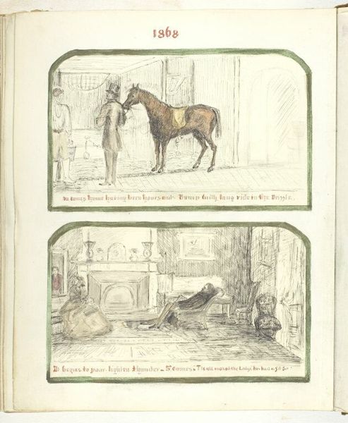 Editor: This print, "Het trouwen zal, zo lang de waereld staat, geschien. / Dit doet u deeze prent, met zyn sieraaden zien," roughly translates to "Marriage will occur as long as the world exists/This print will show you it's ornaments." It's an engraving, likely from sometime between 1715 and 1813 and attributed to J. Robyn. I find its layout fascinating; two scenes, one above the other. What jumps out at you in terms of its form? Curator: The bifurcated composition presents a clear visual distinction, allowing us to engage with each scene independently before considering their potential relationship. Note the strong linearity inherent in the engraving technique. How does this emphasis on line contribute to the overall aesthetic? Editor: It gives a rather stiff feel to the characters and also defines the shapes, of course. Each scene feels contained. Is that deliberate? Curator: Precisely. Consider the lines not merely as outlines, but as structuring elements. Observe how they delineate space, separate figures, and create a sense of order. Even within the "quirky sketch," a structure presides. Editor: So, you are looking at how the artist builds this overall organization for each box to fit together formally. Curator: The repetition of the horse and the stylistic treatment of figures function to echo compositional balance within both. One could say it proposes the idea of marriage through similar structural values? How might viewing them as separate planes further affect our interpretation? Editor: Interesting... Maybe that even if marriages have their up-and-down moments that the tradition itself provides some sense of structure. Well, looking at the piece, knowing this, provides an interesting formalist approach. Curator: Indeed. Attending to structure unveils deeper resonance beyond any illustrative quality it might initially possess.