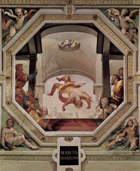 Curator: Here we have Domenico Beccafumi's "Scene of Roman Justice" from 1535, a painting originally a fresco, capturing a particularly dramatic historical moment. What leaps out at you first? Editor: The theatricality, absolutely. All that intense action, frozen in time. It feels like a play frozen at its most heightened moment. Curator: Indeed. It has that High Renaissance grandeur about it, doesn't it? What's interesting to me is how Beccafumi, despite embracing that style, subtly undermines it. Notice how the composition is packed into this oddly-shaped octagonal frame, almost bursting at the seams. It disrupts the expected harmony. And look closely at the pigment, do you notice its application? Editor: There are layers, many thin layers with visible brushstrokes. The process is pretty demanding and requires skilled hands to achieve the overall design and depth effects. Curator: Precisely! You sense the labour, the physicality of its making. But getting back to that inherent drama, it really works with his treatment of color and light, doesn't it? The spotlight on the executioner and the stark contrast against the shadowed onlookers. Editor: The faces! I want to know what everyone's thinking, they almost steal the spotlight, like an ancient Greek chorus reacting to tragedy. What is he trying to convey about this moment in Roman history? Curator: Well, the inscription suggests the figures depicted may be Spurius Cassius, a consul of Rome in the 5th century BC, traditionally put to death for aspiring to be king. However, given that Beccafumi never definitively names the subject, it allows for greater interpretive liberty. Editor: This piece almost screams “power”. In a lot of figurative work during that period, particularly those done in fresco, that comes as no surprise since they commissioned a lot of them to represent stories with an allegorical representation of virtue. Curator: So while the scene is undeniably violent, maybe the intention was also to glorify, to send a very public moral lesson. Editor: It definitely is intense. I love that its materials still give it life even now, and that through its artifice we are still contemplating the very definition of “justice.” Curator: Beautifully put. Beccafumi captures that perennial tightrope we all walk as social creatures caught in the middle of right, wrong, and the ever-elusive notion of justice.