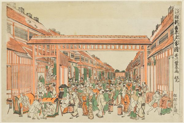 Curator: Looking at this drawing, there's a definite sense of order and decorum to the space and figures. What are your initial thoughts? Editor: Well, I find it incredibly charming! It's light and airy, despite the rather formal architecture. There's a sense of anticipation, almost like a stage set about to come alive with music. Curator: It certainly is intriguing. What we have here is a drawing entitled "Danshuis 'De Pijl'" which translates to “Dance House 'The Arrow'”. It was created by an anonymous artist, somewhere around 1810-1813, using pen and ink on paper. It currently resides in the Rijksmuseum. Editor: An anonymous hand – fitting, in a way, since it allows us to focus on the broader picture, the atmosphere of this dancing house itself. I’m curious, given that classical elements are present such as the statue alcoves, what was the cultural context for a building like this? Was this simply about entertainment? Curator: Not entirely, no. Dance was very carefully observed. Notice how the figures at the periphery observe those who perform? It’s a social theater, establishing a very public awareness of hierarchy. Dance halls acted as spaces to rehearse civic, communal life under social observation. Editor: So the symbolism extends beyond the architectural nods to antiquity and the carefully placed decor? The gestures and the arrangement of figures become significant, as well? The image depicts something beyond leisure and decor. It also reveals cultural codes and values. Curator: Precisely! The symmetry and classical allusions, even down to the dancers’ poses, project an idea of order. Even the costumes act like icons. Every component conveys cultural significance to viewers in this place, at this time. Editor: It strikes me that such meticulously designed leisure speaks volumes about the controlling societal dynamics of that time. And it reveals as much today for those looking at this image and who find these social spaces now as restrictive and fraught as this image depicts. Curator: Yes, through a space ostensibly dedicated to pleasure and beauty, we also get a glimpse into the way social rituals shape, and sometimes confine, individual expression. This drawing serves as an invaluable record. Editor: It’s fascinating how a seemingly simple image can reveal such layered meanings once you start digging. Curator: Indeed. A window into a world of subtle performance and silent narratives.