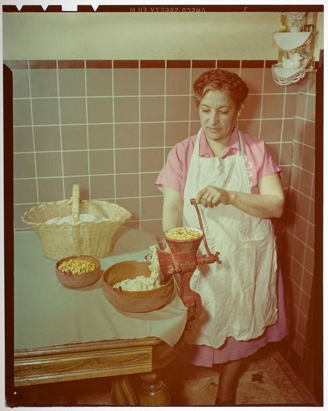 Curator: Here we have an untitled photograph by Jack Gould, depicting a chef preparing something in the kitchen. It's intimate, almost like catching a quiet moment. Editor: The composition is striking. All the lines—the whisk, the edge of the table, even the tiles in the background—converge toward the center, creating a sense of focused energy. Curator: Absolutely. There's a stillness to the chef's concentration, contrasted with the implied motion of the whisk. It makes me wonder what he's about to create. Editor: I'm intrigued by the limited color palette, dominated by earth tones. It feels very much of its time, almost nostalgic. Curator: It does capture a sense of a bygone era, doesn't it? A quiet scene, elevated through Gould's eye for detail. Editor: A simple moment, rendered significant by composition and light. It invites contemplation of everyday tasks. Curator: Indeed. It reminds me that art can find beauty in the most unexpected places.