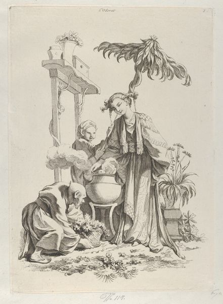 Curator: We are looking at Pierre Aveline’s print, "The Four Elements," made between 1738 and 1749. Currently, it resides here at the Metropolitan Museum of Art. What strikes you first? Editor: It’s quite charming. Delicate. Almost like a porcelain figurine come to life. The bird imagery makes the association to the air very evident. Curator: It's important to consider the context of its creation. Aveline worked in a period where printmaking was developing into a critical medium for disseminating ideas and representations of the world, and we see this Chinoiserie style becoming wildly popular among European audiences. Editor: Ah, Chinoiserie. That Western appropriation and fantasy of East Asian aesthetics. But look how this style extends to representing the natural world. There’s an element of control here. The bird is caged; nature is ornamental, almost submissive. This reflects a European desire to classify and possess, not just physical objects, but knowledge itself. Curator: That's certainly part of the story. The allegory of the four elements was a familiar theme in European art, providing opportunities to display knowledge and also to display artistic virtuosity through composition and the refinement of technique. Prints such as this were reproduced in books, as illustrations of literary material, for instance, so the audience for these kinds of allegories would have understood and appreciated the details of the narrative depicted here. Editor: And I wonder, considering the proliferation of this type of imagery in Europe at this time, whether the consumption of it had real effects, feeding certain stereotypes and even helping shape and normalize colonial enterprises in the East. Curator: It definitely brings to the foreground those discussions of art and its complicity with power. Well, this print offers plenty of insights into artistic trends, but also into the more profound societal tensions. Editor: Agreed. It prompts critical examination of our perceptions and their histories, something museums should continuously encourage.