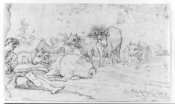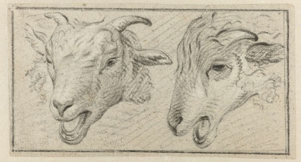 Editor: This is *The Reunion of Esau and Jacob* by Willem Panneels, dating from about 1628 to 1630. It's a drawing made with pencil, currently held at the SMK in Copenhagen. There's a compelling starkness to the image, emphasized by the shading. What do you see in this piece? Curator: I see echoes of ancient myths rendered anew. Note the two bullocks, placed side-by-side, but seemingly unaware of one another. Do they signify the fraternal twins Esau and Jacob, as the title indicates? Are these portraits imbued with the tension inherent in their biblical narrative? Editor: You're right, there's a definite lack of interaction. Their averted gazes hint at conflict or separation, I think. How might Panneels be using animal imagery to represent human relationships? Curator: Animals have long served as powerful metaphors for human characteristics, often used in classical art as allegory. Here, the bovine might embody notions of strength, stubbornness, or even sacrificial offerings. Think of Europa and the Bull. Editor: So, by depicting Esau and Jacob as these two bulls, Panneels is tapping into a deep well of symbolic association? It moves beyond just illustrating a biblical scene. Curator: Precisely. The artist seems interested in the *psychology* of reconciliation. Even in reunion, can there still be an undercurrent of unease or primal animal instinct? The unfinished aspect heightens the emotional tension as the artist captures the very essence of these feelings with this medium. Editor: I hadn't considered the symbolic weight of the animals. This makes me think differently about the artwork’s intention, it seems charged with hidden meaning. Curator: Indeed! And sometimes, that's where the true heart of the image lies, in its layered, resonating meaning that can endure.