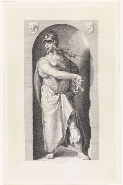 This is an engraving of ‘Geloof naast altaar met lam op boek met de zeven zegels’ by an anonymous artist, whose date of creation is unknown, residing here at the Rijksmuseum. The composition balances a central female figure with symbolic elements. Notice how the engraver used line work to define texture and form, creating a contrast between light and shadow. The immaculate lines form an allegorical scene that invites contemplation. The figure is placed next to an altar, upon which rests a book sealed seven times, accompanied by a lamb, traditional symbols of faith and sacrifice. Above, a dove within a triangle, signifying the Holy Spirit, is centered, creating a hierarchical structure that guides the viewer’s eye upward. This arrangement echoes theological notions of the divine order. The precise lines of the engraving highlight a tension between earthly representation and spiritual significance. Consider how such visual encoding invites a deeper understanding of faith and its allegorical representation through a structured visual language.