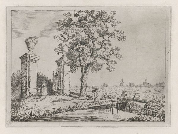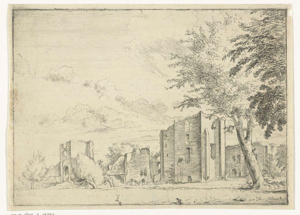 Gilles Demarteau created this ink drawing of a landscape with a ruin and shepherdess with cattle. Demarteau, living in a time of aristocratic rule, offers us a peek into the idealized pastoral life, a popular theme that often glossed over the harsh realities faced by the working class. Here, the crumbling ruin serves not as a symbol of decay or social commentary, but as a picturesque backdrop to the shepherdess and her cattle. The drawing invites us to appreciate the aesthetic beauty of a romanticized rural scene, rather than question the structures of power at play. Are we, as viewers, being positioned within a specific social fantasy? Do we find ourselves momentarily complicit in an aesthetic rendering of the world that actively obscures real-world issues? The drawing thus presents a dual experience: a surface of bucolic tranquility, and a subtext of social and economic disparities quietly veiled beneath.