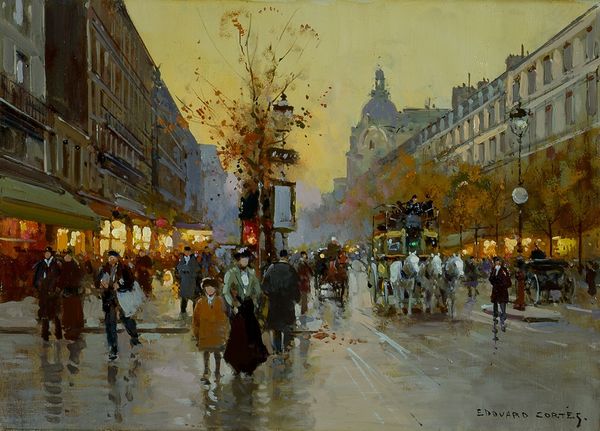 Curator: Oh, this shimmers. It's got that 'slightly melancholy but secretly joyous' vibe going strong. Editor: Indeed. What we have before us is Edouard Cortes’ "Boulevard de la Madeleine," an oil painting that beautifully exemplifies the Impressionist movement's fascination with capturing fleeting moments. The painting encapsulates a slice of Parisian street life, though it doesn't have a specific date attributed. Curator: Fleeting is spot on! It feels like I'm spying on a memory, not a photograph. All blurry edges and golden light...did it always feel like this to stroll along Parisian boulevards? Slightly damp and utterly romantic, even the traffic seems poetic! Editor: There's a strong compositional strategy here, with a deliberate orchestration of color and light to evoke a mood. Cortes masterfully uses light not merely as illumination, but as a structural element. Note how the darker hues create depth and contrast. Curator: Contrast is everything, isn't it? The dark clothing against the light buildings, the hazy pink sky peaking out... It is almost staged, or filtered somehow! Do you think he cleaned it up and sweetened it a bit? Like an early Instagram filter? Editor: Interesting! Perhaps not intentionally 'filtered', but certainly constructed. The precision and painterly technique do echo Impressionist principles, whilst his control of composition places him slightly apart, with perhaps more of a traditional leaning. This approach makes it a compelling artwork that balances realism with an evocative atmospheric charge. Curator: That makes perfect sense! Well, whatever he was doing, I'm packing my imaginary beret and jumping into that painting. I feel so ready to stroll through that little slice of Parisian heaven right now, maybe stop and pick up some chocolates along the way... Editor: Perhaps later. For now, one can simply appreciate how Edouard Cortes turns ordinary urban existence into an invitation of reflection on time, perception, and the undeniable allure of city life.