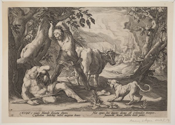 Curator: Hendrick Goltzius, a Dutch printmaker, created this engraving around 1590. It's titled *The Daughters of Cecrops Open the Casket Entrusted to Them by Minerva.* Editor: Immediately striking is the way the stark light defines every line, giving a kind of hard, insistent realism to an otherwise fantastical scene. It's visually arresting, if a little unsettling. Curator: The narrative delves into a classical myth, specifically a moment of disobedience and the consequences that follow. We see the daughters of Cecrops, king of Athens, ignoring Minerva's explicit instructions not to open the casket she'd entrusted to them. This myth explores themes of curiosity, trust, and the power dynamics between mortals and gods. How do you read those power dynamics here? Editor: Power seems channeled primarily through compositional balance and line. The eye is drawn upward from the figures to the knotty trunk of the tree, with all three women arranged to direct this vertical movement. There's a clear triangulation that roots them visually, before your eye leaps to the background. It feels controlled and precise. Curator: Right, the setting too speaks to broader cultural anxieties of the period. The idyllic landscape, while seemingly serene, actually represents a fraught space of vulnerability for women. They are literally exposed and vulnerable to outside forces in the wake of opening Pandora's box or breaking some similar sacred trust. The male gaze is inherently coded into this. Editor: Certainly, and the visual language supports that. The rendering of musculature on even these female figures contributes to this intense dynamic and sense of forced revelation that’s happening. The snake twining around the basket creates this feeling. It is all part of the engraving's dramatic impact. Curator: I think seeing this print within broader discourse that's happening during this era--that connects women to forbidden knowledge and societal expectations really is crucial to unlock the deeper themes embedded here. It's not just about the mythological tale but a mirror reflecting society’s fears. Editor: True, viewing it in this manner can significantly increase your insights on a work like this, far from only simply contemplating the pure formality of its aesthetic structure. Curator: And hopefully reveals some questions still being discussed to this day.
