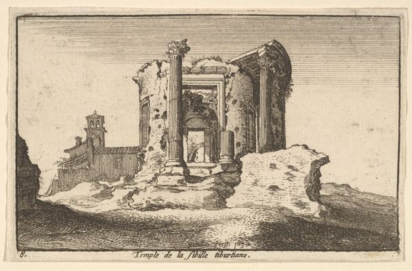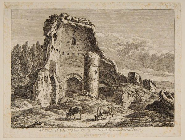Editor: This is Leonardus Schweickhardt's "Rocky Landscape with Houses," likely created sometime between 1793 and 1862. It's an engraving, a print. I'm immediately drawn to the contrast between the imposing rock formations and the delicate details of the cityscape. What do you see in this piece? Curator: It's fascinating to view this engraving through the lens of 19th-century Romanticism and its focus on ruins. Notice how Schweickhardt isn't just depicting a landscape, but actively framing a meditation on time, as clearly evidenced in the French text etched below, hinting at both destruction and creation. Where would this type of imagery be consumed? Who was viewing and buying? Editor: Good question. Presumably, prints like this were more widely available than paintings. Perhaps a burgeoning middle class interested in art but without access to wealthy collections? The style definitely caters to Romantic sensibilities, right? The dramatic landscape, the implication of human insignificance… Curator: Exactly. And think about the sociopolitical context! These images, often distributed as prints, offered viewers a picturesque escape but also subtly reinforced ideas about history, nature, and national identity. Were they just consumers, or were these prints contributing to social changes, even nationalistic fervor? Consider its availability, its cost to access the imagery, and the location where art like this was consumed and enjoyed. Editor: It makes me think about the power of imagery in shaping public opinion, even through something as seemingly innocent as a landscape print. I never thought about art consumption that way. Curator: That's the crux of it! By examining these pieces within their historical moment, we start to unravel the complex ways art was interwoven with social, cultural, and political currents. The history is etched right into these prints. Editor: This has completely changed how I look at landscapes! Now I see stories within them, dialogues with the past, with complex political issues that I had never stopped to examine before.