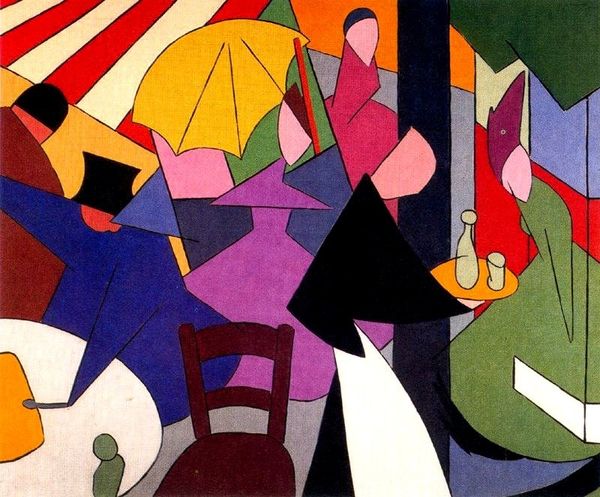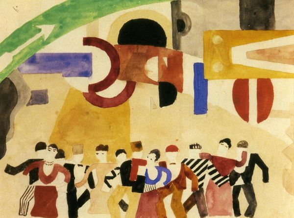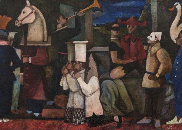 Editor: Wow, this makes me feel a little claustrophobic. It's like being swallowed by a crowd, all those hats! Curator: Indeed! This is John Dodgson's "Market Place," currently held at the Tate. Dodgson, who lived from 1890 to 1969, captured a fascinating scene, focusing on the collective experience of a marketplace. Editor: It’s a buzzing sea of humanity. I wonder what they're all looking at? The colors are so muted, and yet there's this intense energy. Like a low hum that vibrates in your chest. Curator: Precisely. The perspective, intentionally flattened, emphasizes the shared space, echoing theories of collective identity and the individual lost within the mass. Editor: There's something very human about it. I mean, that slightly awkward feeling of being shoulder-to-shoulder with strangers is captured beautifully. Curator: I think what Dodgson achieves here, by simplifying the forms and prioritizing the mass, is a powerful comment on the nature of public life. Editor: Well, whatever it is, I'm ready for a quiet cup of tea. This crowd is making me thirsty. Curator: I agree. It does invite a moment of reflection on our own place within the collective.