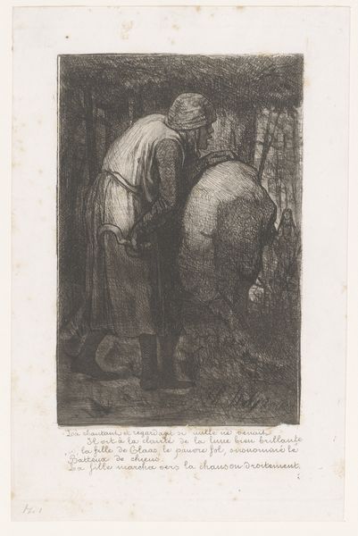 Alexandre-Gabriel Decamps created this print, titled "Pig Keeper," using etching, a process that involves using acid to cut into a metal plate. Decamps lived through a period of significant social upheaval in France. Decamps was known for his Orientalist works, inspired by his travels to the Middle East. But here, rather than those exotic scenes, we see what appears to be a humble pig keeper. His back is turned, his simple clothing rendered in great detail; Decamps seems interested in representing the dignity and presence of labor. The figure is positioned against a landscape that blurs into the distance, creating a sense of both isolation and connection to the land. Consider how the artist’s choice to depict the figure from behind invites us to contemplate the narratives and histories of working-class individuals often unseen in art. What does it mean to turn away from idealized subjects and towards the working classes? Decamps makes visible the lives that sustained French society, prompting reflection on the values and social structures of his time.